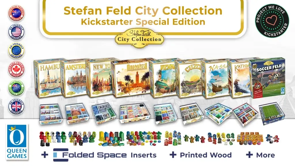 Dazu eröffnet Soccer Feld als neuer Eintrag in die City Collection mit Kickstarter-exklusiven Inhalten einen frischen Zugang zur Serie – ideal für alle, die jetzt in die Welt der Stefan-Feld-Städte einsteigen oder ihre Sammlung aufwerten wollen.
