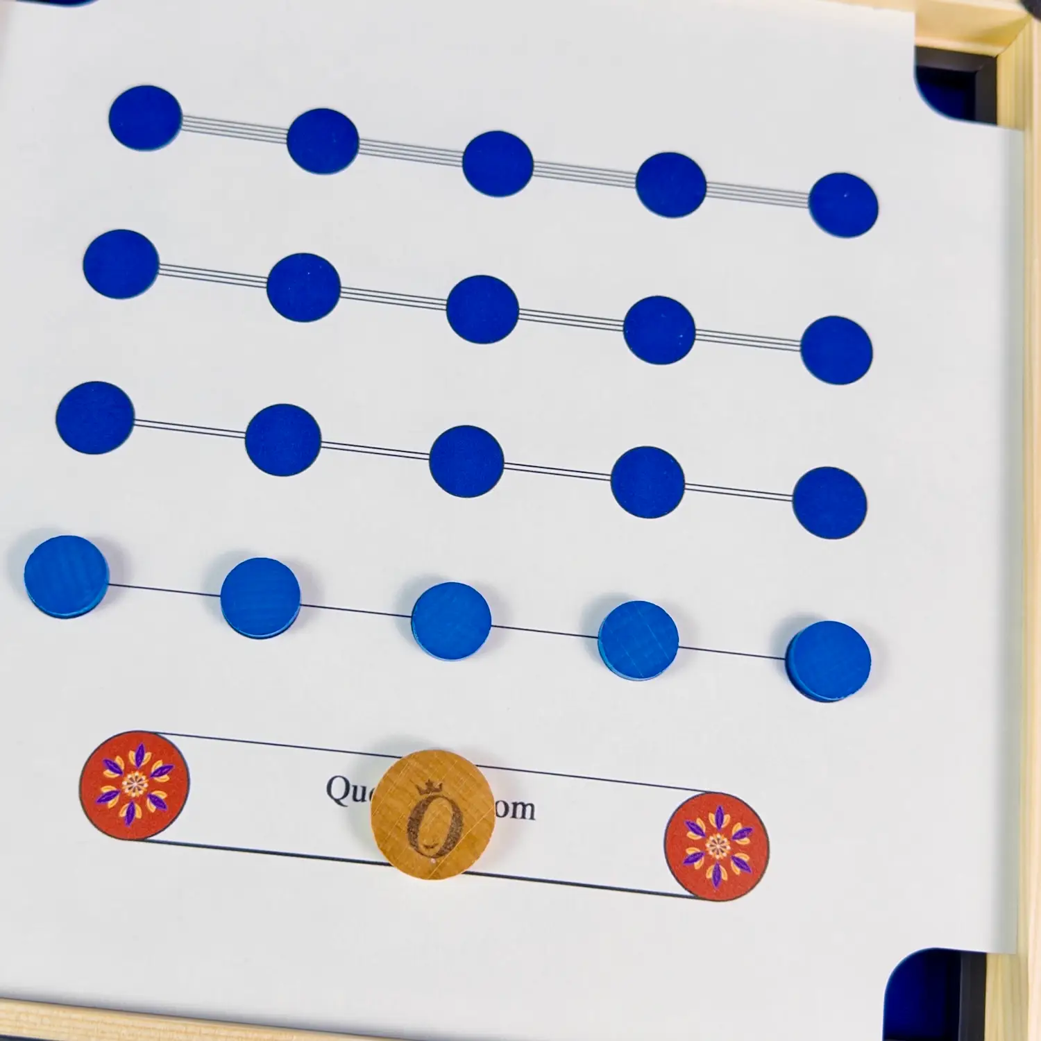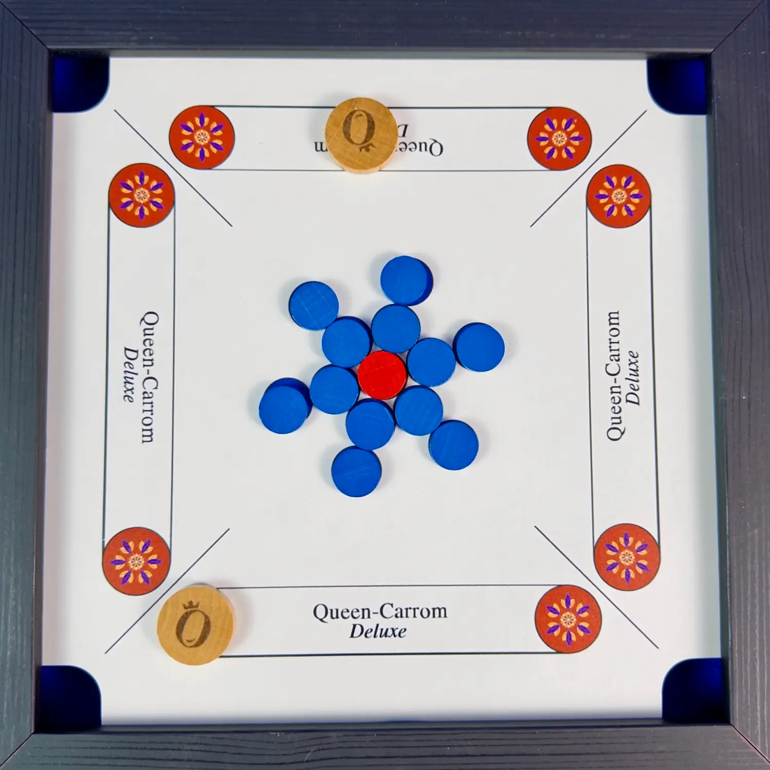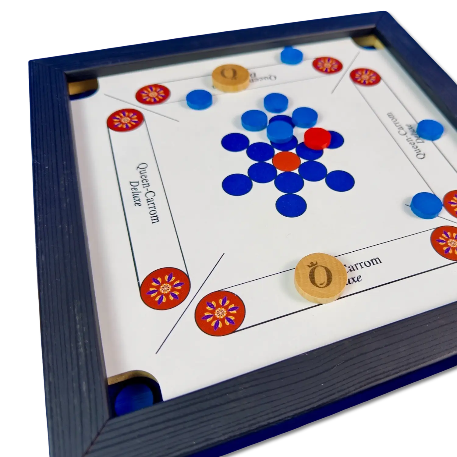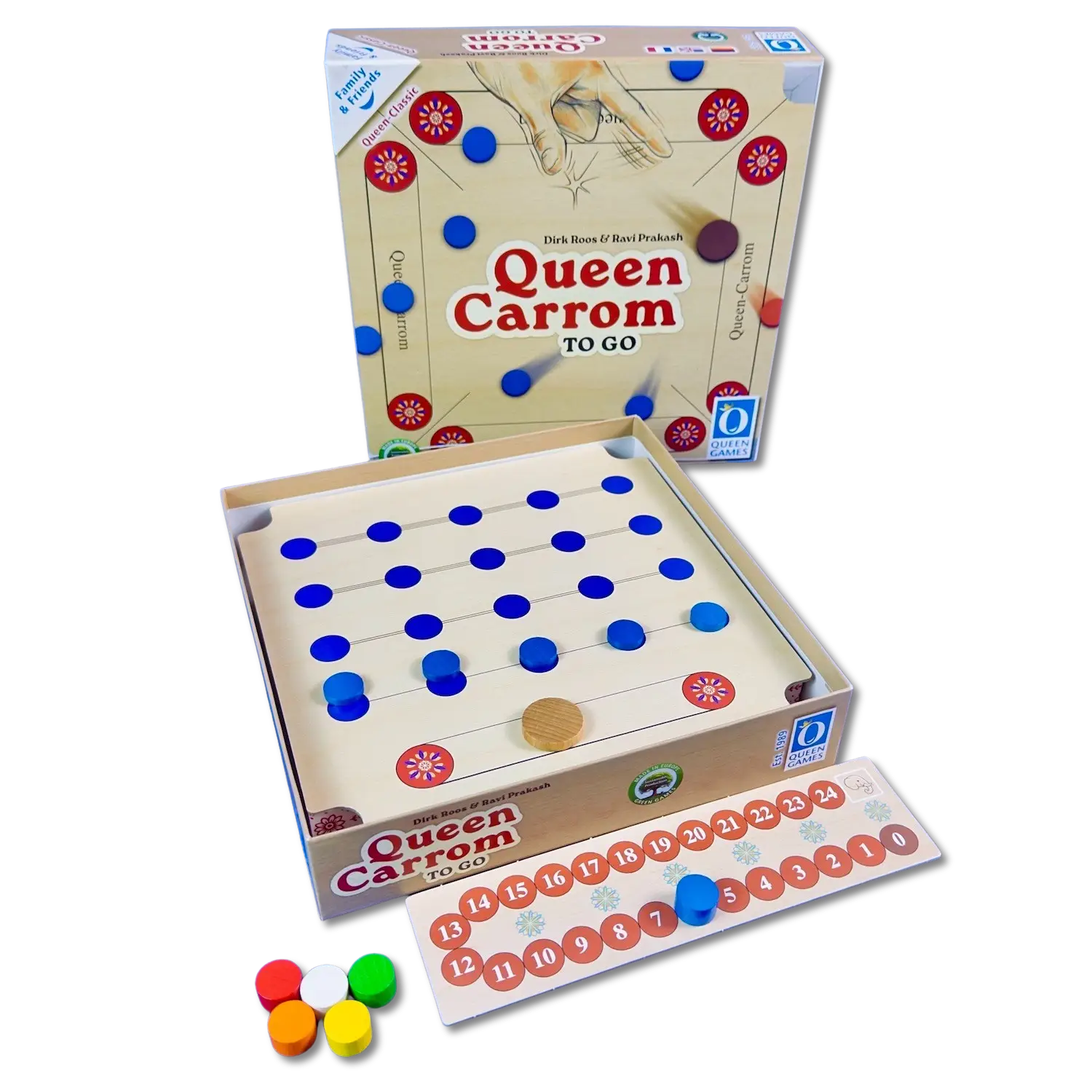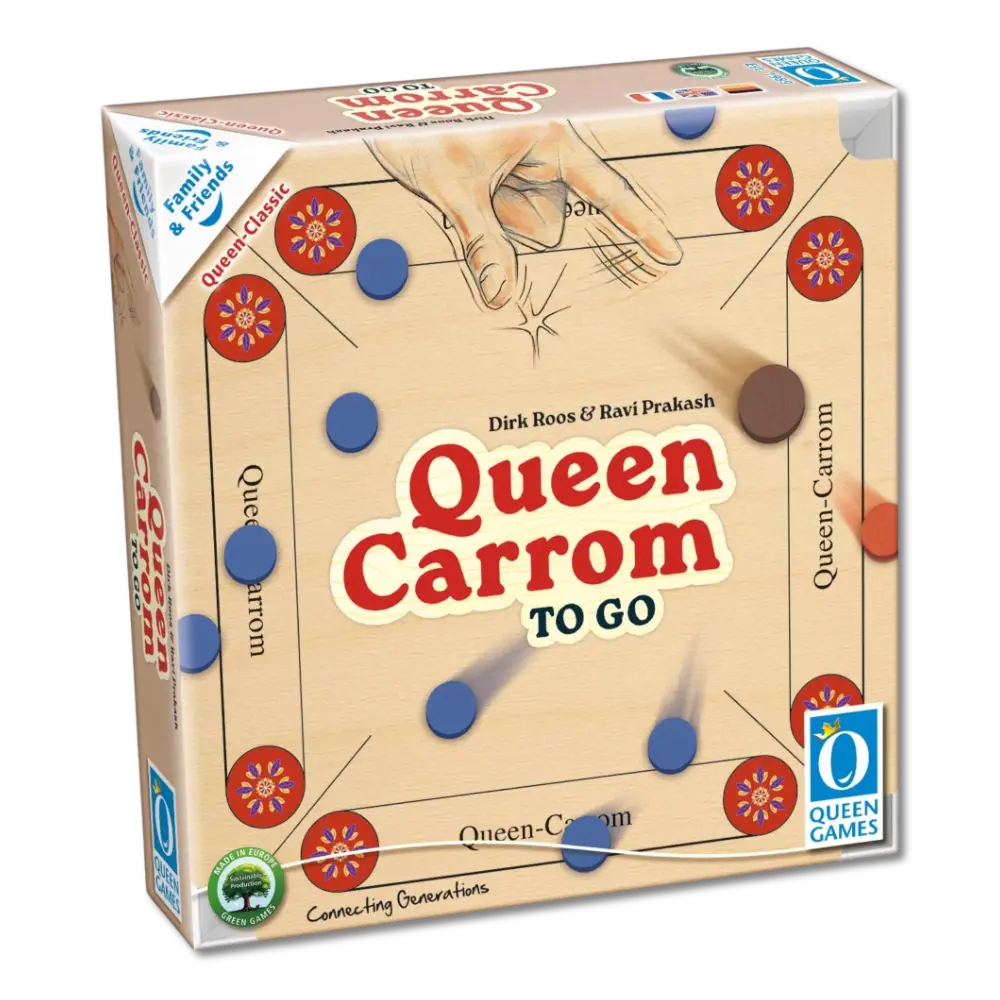 Queen Carrom To Go ist eine portable Version des klassischen Carrom-Spiels. Du spielst auf einem verkleinerten Holzbrett und schnippst deine Spielsteine mit dem Finger in die Ecktaschen. Ziel ist es, deine eigenen Steine vor den Mitspielern zu versenken und dabei den Ablauf sauber zu kontrollieren. Die reduzierte Größe erlaubt schnelle Partien und einen unkomplizierten Aufbau – ohne das Grundprinzip von Carrom zu verändern.